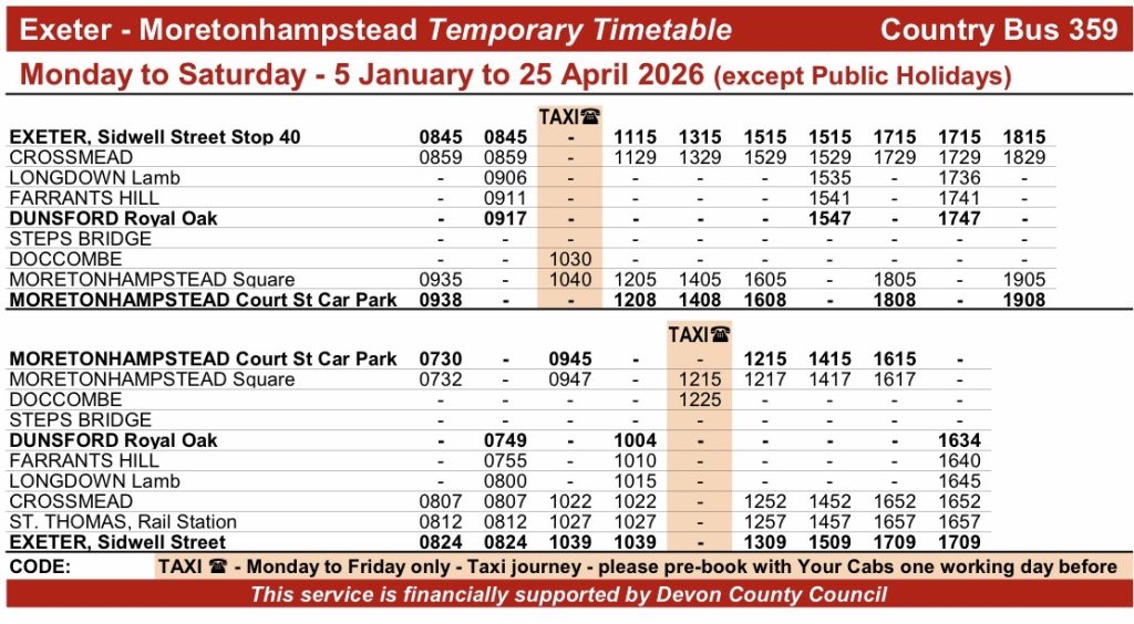 | Moretonhampstead Court St Car Park | 09:38 | - | 12:08 | - | 14:08 | 16:08 | 18:08 | - | 19:08 | ||